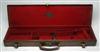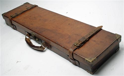 A BRASS-CORNERED SINGLE LEATHER GUNCASE, fitted for 30in. barrels, lined with red baize, brass lock (key missing), interior lid with an 'ARMSTRONG & CO.' trade label,