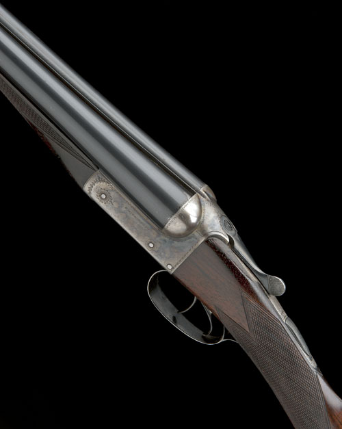 30 1/4in. nitro reproved barrels, rib engraved 'C. SMITH & SONS. 47, MARKET PLACE. NEWARK-ON-TRENT', 2 1/2in. chambers, bored approx. true cyl. and 1/2 choke, treble-grip action, automatic safety, border engraving, retaining some original colour-hardening and finish, 15 3/8in. figured stock including 1in. wooden extension, weight 6lb. 14oz.