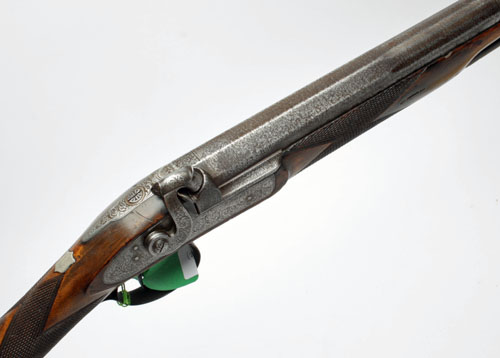 A CASED 15-BORE PERCUSSION SINGLE-BARRELLED SPORTING GUN SIGNED H. HOLLAND, no visible serial number, circa 1840, with triple-staged twist-steel 27 1/2in. barrel signed 'H. HOLLAND, 98 NEW BOND STREET LONDON' (feint, rib loose), stepped patent breech, bar-action engraved lock signed 'H. HOLLAND', (spur of hammer broken off) walnut chequered half stock with engraved iron funiture and original ramrod (tip missing), TOGETHER WITH a derelict leather case with 'H. HOLLAND' trade-label, worn throughout