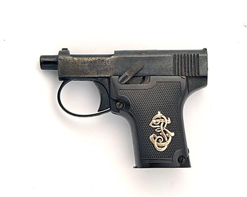 A 6.35mm (.25ACP) SEMI-AUTOMATIC POCKET PISTOL SIGNED 'WEBLEY & SCOTT', MODEL '1912 POCKET HAMMERLESS', serial no. 106777, circa 1920, with 2in. barrel, blued, sighted slide and blued frame, black hard-rubber chequered grips (one with inlayed gold monogram), finish lightly worn, action at fault