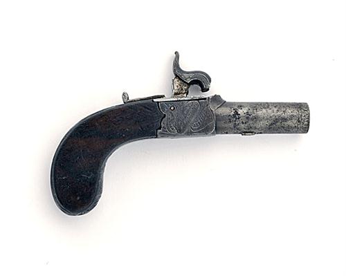 A 38-BORE PERCUSSION POCKET-PISTOL SIGNED 'C. PARKER, BURY ST. EDMUNDS' circa 1850, with 1 1/2in. turn-off barrel (frozen), engraved band at the muzzle, engraved boxlock central-hammer action signed by the maker (at fault, hammer repaired), slab-sided walnut butt with later chequering, concealed trigger