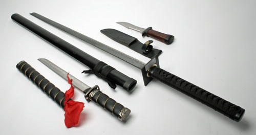 A REPRODUCTION NINJA KATANA TOGETHER WITH TWO OTHER KNIVES,