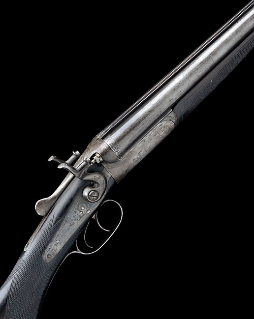 28in. nitro reproved barrels (in 2011), rib engraved 'W. DARLOW. BEDFORD.', 2 1/2in. chambers, bored approx. true cyl. in both, rebounding back-action locks, border and scroll engraving, 14 1/4in. semi-pistolgrip stock including buttplate, fore-end with (later) off centre horn finial, weight 4lb. 12oz.