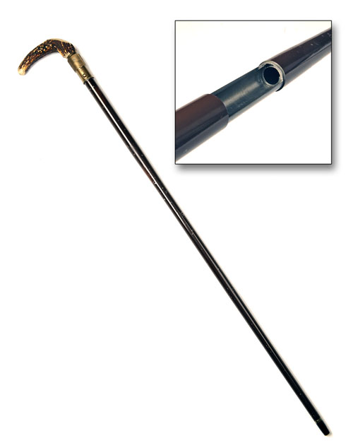circa 1930, re-proved in London in 1980, with 24 1/2in. barrel, the outer surfaces coated in brown enamel, removable horn ferrule, knurled brass action section with push-button trigger and crooked antler walking-stick handle, the whole in good condition