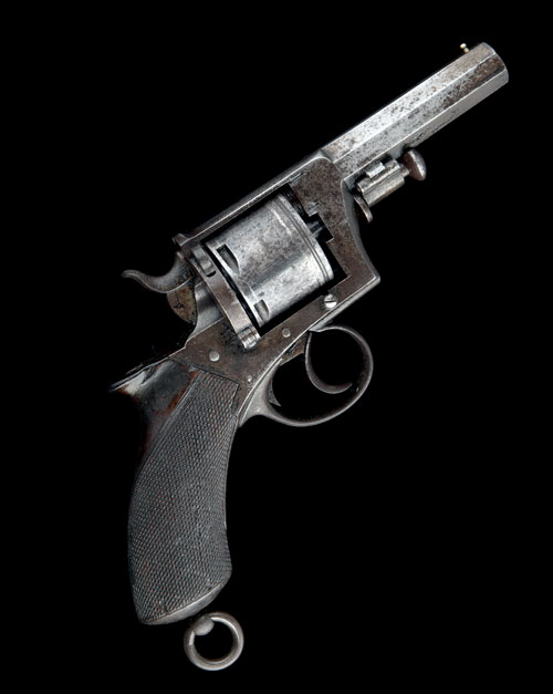 circa 1878, with 4in. octagonal barrel, pillar fore-sight, the notched top-strap signed 'CHAS INGRAM, RENFIELD ST, GLASGOW', plain cylinder with rope border to the front edge, solid frame with hinged loading gate and side safety, finely chequered one-piece walnut saw-backed grip, iron butt-cap with lanyard ring and hinged swinging ejector stored under barrel and in cylinder arbor, the whole with traces of original finish