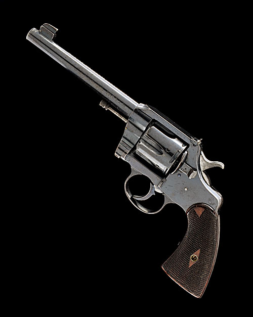 with 6in. blued, tapering barrel signed 'COLT'S PT FA MFG CO HARTFORD CT USA' together with patent dates to 1901, fore-sight with removable element, windage adjustable rear-sight, flat-top target-style receiver, blued fluted swing-out cylinder, fully chequered walnut grips and finely chequered back-strap, the whole retaining much original finish
