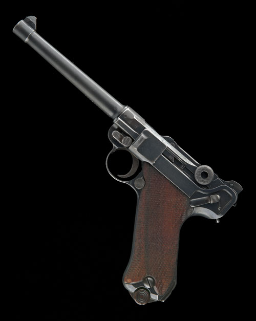 circa 1908, with 6in. sighted barrel, sliding adjustable sight to rear of toggle-action, receiver with Naval acceptance marks, chequered wood grips, the back-strap cut for shoulder-stock and correct Naval-type wood-based magazine not numbered to the gun, otherwise all matching numbers, the pistol with additional registration number under barrel, the whole with much original but lightly frosted blue and traces of straw finish