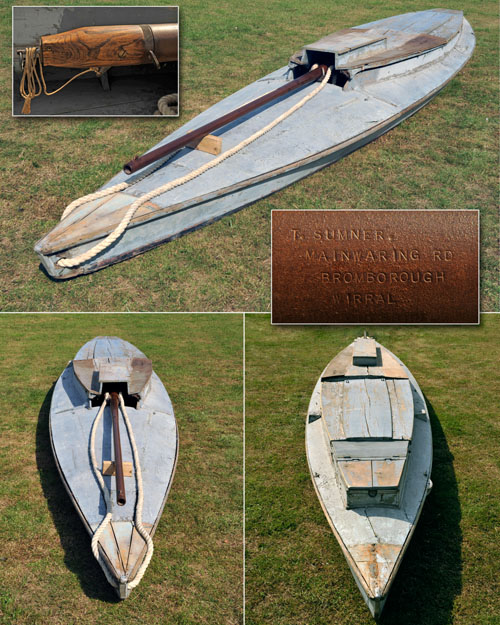 93 1/4in. black powder only two stage barrel with integrally mounted trunnions, and applied copper blade foresight, brass, steel and oak screw plug action, ring pull manual cocking, lanyard operated trigger, barrel breech end stamped 'T. SUMNER, MAINWARING RD, BROMBOROUGH, WIRRAL, CHESHIRE', and '4OZ. PUNT POWDER 20 OZ. SHOT' and with the BP crown proof mark, the double-punt of 24ft. in length and 3ft. 9in. in the beam, mainly of lancewood with oak floor and ash knees, heavy rope recoil lanyard secured to stem piece, traditional canvas covering to decking (worn in places), complete with a variety of copper-ended setting poles, a sculling oar and one hand paddle, the vintage is unknown but is thought to be probably 1920s or 1930s, the punt is in structurally sound order but would benefit from light cosmetic restoration overall.