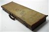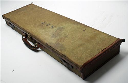 A CANVAS & LEATHER SINGLE GUNCASE, fitted for two sets of 30in. barrels, lined with maroon baize, brass lock (including Key), the interior lid with a 'BOSS & CO ' trade label, the exterior lid with the monogram 'N.E.T.'.