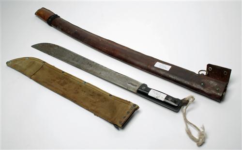 A WORLD WAR TWO LEATHER FIELD SCABBARD FOR A JAPANESE KATANA together with a US Marine Corp issue jungle machete, both with minor losses