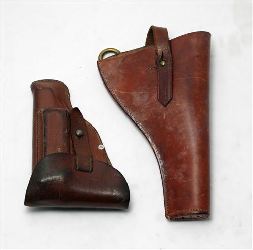 A HOLSTER FOR A WALTHER 'PP', in brown leather and dated for 1942, TOGETHER WITH an open-topped leather holster for a .455 Webley service revolver, dated for 1940
