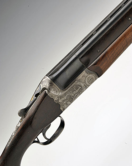 AYA 12-BORE 'CORAL' SINGLE-TRIGGER OVER AND UNDER EJECTOR, serial no. 126986, 30in. nitro demi-bloc barrels with 8mm ventilated matt top-rib, 2 3/4in. chambers, bored approx. 1/2 and full choke, scroll-backed action, hold-open toplever, selective single-trigger, carved in relief with woodland scenes, bright finish14 1/4in. semi-pistolgrip stock