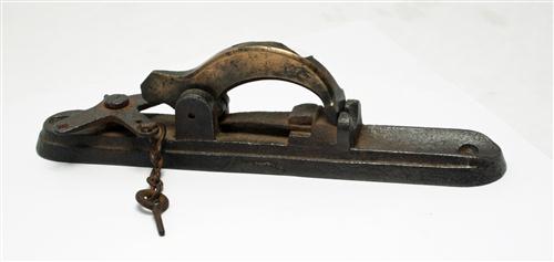 AN UNUSUAL VICTORIAN ALARM-GUN with heavy cast-iron mounting-plate, bronze striking arm and iron multi-directional tripwire operated trigger (iron surfaces pitted)