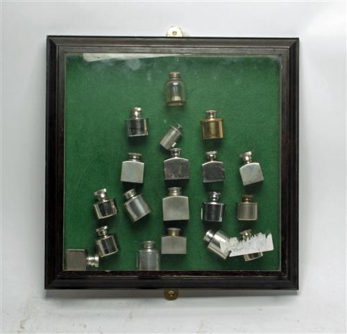 A GLAZED CASED DISPLAY OF VINTAGE OIL BOTTLES BY ENGLISH GUNMAKERS,