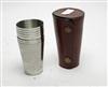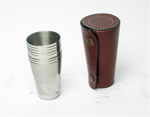 † A NEW & UNUSED RAY PAVON QUALITY SET OF EIGHT STAINLESS STEEL TUMBLERS, in fitted leather case with brass studs.