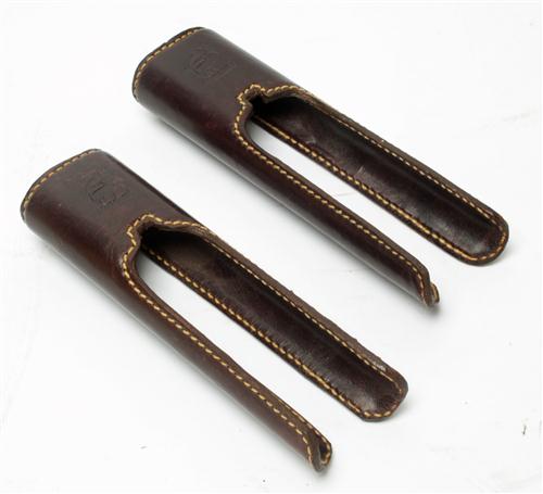 A NEW & UNUSED PAIR OF LEATHER SIDE BY SIDE HAND PROTECTORS.