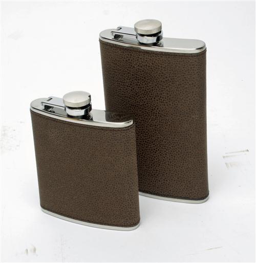 A PAIR OF NEW & UNUSED NUBUCK BOUND STAINLESS STEEL HIP FLASKS,