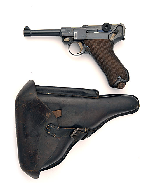dated for 1916, with 4in. sighted barrel (proved 2011), blued finish and chequered wooden grips, all matching numbers except wood-based magazine (numbered 6672), the whole retaining much finish throughout TOGETHER WITH a period leather holster dated for 1916