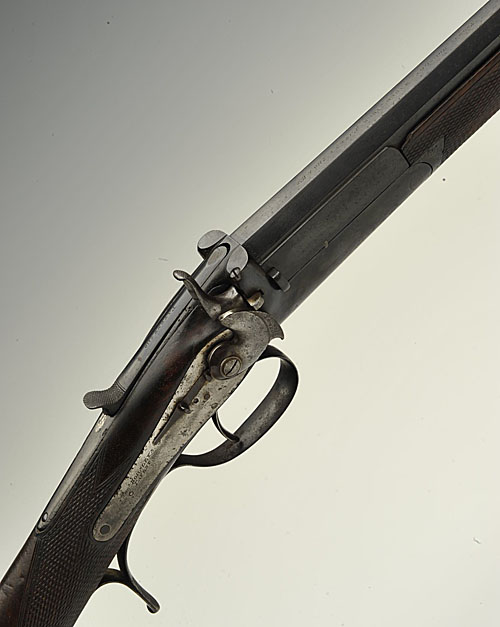 THOMAS HORSLEY'S 1863 PATENT CONVERTED .410 SINGLE-BARRELLED PULL-BACK TOPLEVER HAMMERGUN, serial no. 1755, converted from a park rifle, 26 1/2in. octagonal nitro barrel, the top-flat marked 'THOMAS HORSLEY MAKER YORK PATENT 2410 & 1138', 2 1/2in. chamber, T. Horsley patent action incorporating Horsley patent pull back toplever, patent no. 2410 of 1st October 1863, and Horsley patent retracting striker, patent no. 1138 of 17th April 1867, rebounding bolted sidelock with cammed hammer, stock cracked at hand
