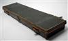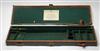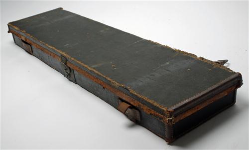 A GEORGE GIBBS CANVAS & LEATHER ROOK RIFLE CASE, fitted for 28in. barrels, lined with green baize, brass lock (key missing), the interior with a 'GEORGE GIBBS ' trade label, the lid hinge is broken.