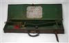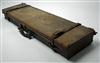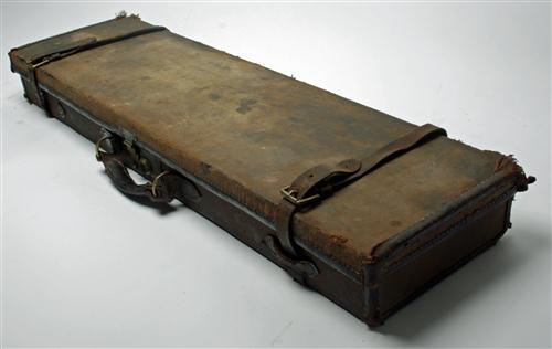 A CANVAS & LEATHER SINGLE GUNCASE, fitted for 29in. barrels, lined with green baize, brass lock (key missing), the interior lid with an un-readable trade label,