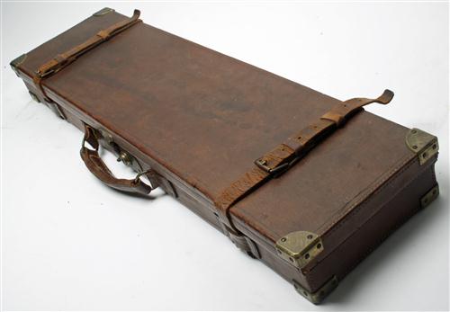 A BRASS CORNERED ARMSTRONG & CO PIG SKIN SINGLE GUNCASE,