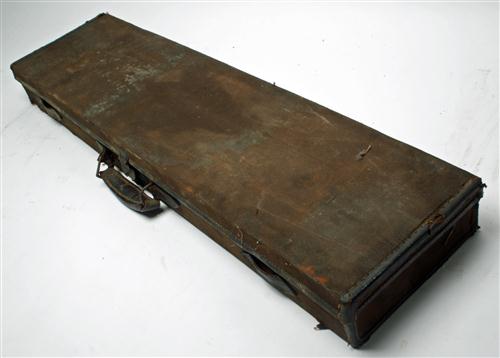 A CANVAS & LEATHER SINGLE GUNCASE, fitted for 32in. barrels, lined with red baize, brass lock (key missing),