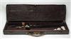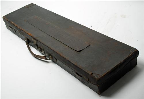 A SINGLE LEATHER GUNCASE, fitted for 30in. barrels, lined with purple baize, including an oil bottle spuriously signed 'WATSON BROTHERS', together with a set of snap caps.