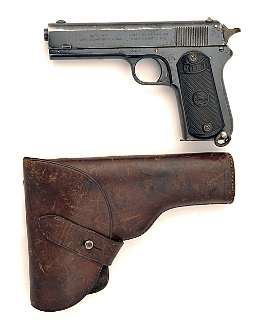 for 1916, with 4 3/8in. barrel, blued sighted slide signed 'COLTS PT FA MFG CO HARTFORD CT USA' and the patent dates 'PATENTED APR 20 1897, SEPT 9 1902', the right hand side stamped with the calibre designation, blued frame, chequered hard-rubber grips with the 'Colt' logo's and lanyard ring to base, much original finish remaining, TOGETHER WITH a period leather holster marked 'HORTON, BUCHANAN ST, GLASGOW' for the same pistol and suitable for use with a 'Sam Browne' service belt (leather lightly marked)