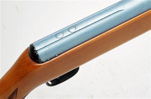 A .177 BREAK-BARREL AIR-RIFLE SIGNED ANSCHUTZ, MODEL '335', serial no. 001632, circa 1975, with blued, sighted 18 1/2in. barrel, plain air-chamber grooved for a telescopic sight and right-handed beech stock, metal surfaces painted light blue