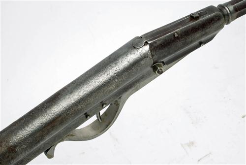 A .177 BREAK BARREL AIR RIFLE SIGNED 'GEM', MODEL '8986', serial no. 17416, circa 1900, with two-stage barrel stamped with the 'Gem' crossed pistol trademark, name and model number, dolls-head release catch and walnut stock, the whole darkly stained with surface pitting and old replacement cocking lever, action at fault