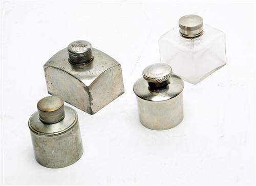 A COLLECTION OF FOUR VINTAGE OIL BOTTLES. comprising of a vintage glass bottle, a nickel plated spuriously signed Kynoch & co oil bottle, two nickel plated oil bottles.