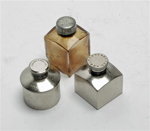 A COLLECTION OF THREE VINTAGE OIL BOTTLES, including a vintage glass spuriously signed James Dixon & sons oil bottle, a nickel plated oil bottle spuriously signed 'W.C. SCOTT ENGLAND', a 'T.E. WOOD & SON' nickel plated oil bottle spuriously signed 'HOLLAND & HOLLAND.