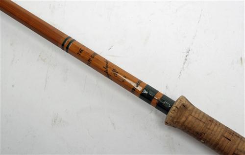 A VINTAGE J.H. McGINN THE HIGHLANDER THIRTEEN FOOT THREE PIECE SPLIT CANE SALMON ROD.