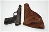 ** A 7.65mm (.32ACP) SEMI-AUTOMATIC PISTOL SIGNED WALTHER, MODEL '4', serial no. 488325, late version circa 1923, with 3 1/2in. barrel, sighted barrel-shroud and slide, plain frame marked 'MADE IN GERMANY' and black plastic chequered grips, fair traces of original finish (action at fault) TOGETHER WITH a leather holster