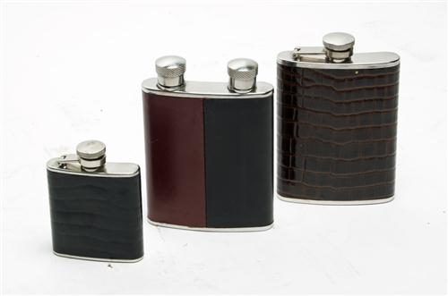 THREE LEATHER BOUND HIP FLASKS Estimate £15-25