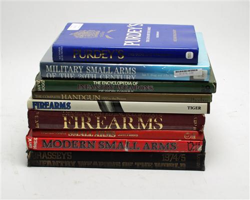 A COLLECTION OF GUN RELATED BOOKS. including 'PURDEY'S THE GUNS AND THE FAMILY'. MILITARY SMALL ARMS OF THE 29TH CENTURY', THE ENCYLOPEDIA OF INFANTRY WEAPONS OF WORLD WAR II', 'THE COMPLETE HANDGUN 1300 TO THE PRESENT', FIREARMS', 'THE ILLUSTRATED ENCYLOPEDIA OF FIREARMS', 'WORD WAR II SMALL ARMS', 'MODERN SMALL ARMS',