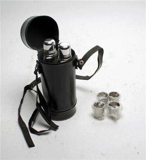 A LEATHER CASED TWO TOT FLASK SET, with four shot cups Estimate £20-30