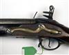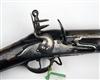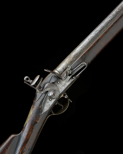 circa 1760, with plain iron 46in. barrel, the breech end faintly inscribed 'No 69', London proofs, slightly curved, radiused lock signed 'R. WATKIN' (possibly refreshed), unbridled frizzen, circular jaws to the hammer, walnut hand-rail type full-stock carved around the top-tang, heavy brass long-spurred heel-plate, the left hand side of butt carved 'Y+C 115' possibly for 'York Castle', radiused serpentine side-plate, heavy brass trigger guard, fore-end joined at rear of first thimble, iron swivels (front broken) and iron ramrod, exposed iron surfaces cleaned and discoloured, woodwork with some bruising commensurate with age