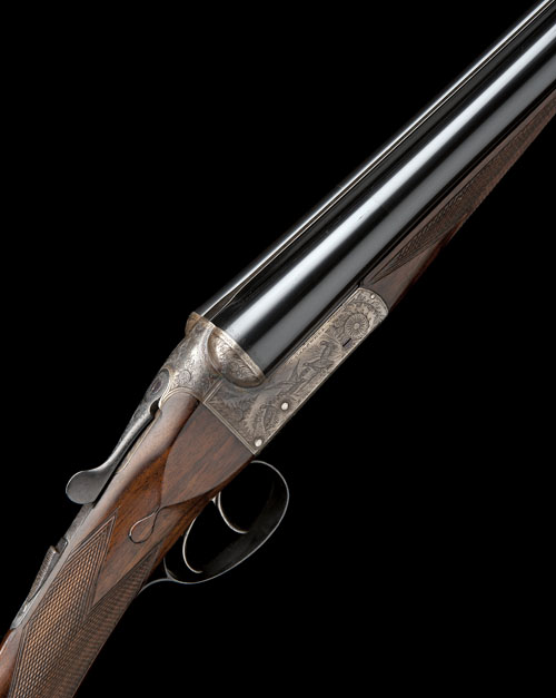 25in. sleeved nitro barrels with matt Churchill-rib, 2 1/2in. chambers, bored approx. 1/4 and full choke, automatic safety, border and scroll engraved action with game scenes of pheasant and partridge, the triggerguard with a pointer, much colour-hardening and finish, 15 5/8in. well-figured stock including 5/8in. ebonite extension, weight 6lb. 2oz.