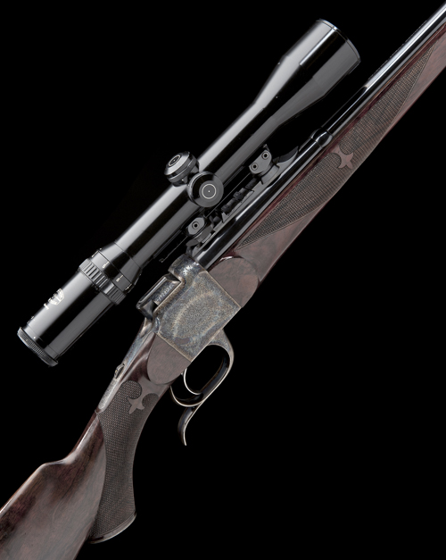 25 3/8in. nitro barrel engraved 'HARTMANN & WEISS. HAMBURG.', finely scroll engraved sight rib with open sights and two folding leaf sights for 100, 200 and 300 yards, ramp-mounted blade fore-sight, mounted with a Schmidt & Bender 4-12x telescopic sight in quickly-detachable mounts, action with 'Hagn' poincon, falling block marked 'HARTMANN & WEISS. HAMBURG.', manual roller safety gold-inlaid 'S' and 'F', fully engraved with best fine acanthus scrolls and retaining virtually full original colour-hardened finish, 13 7/8in. highly-figured pistolgrip stock with cheekpiece, engraved and colour-hardened pistolgrip-cap, sling swivels, fleur-de-lys details to chequering borders and including 1in. rubber recoil pad, weight 9lb. 2oz.