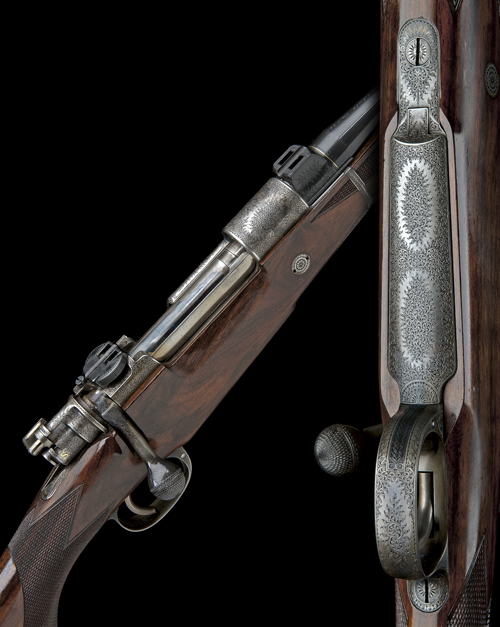 23 5/8in. nitro barrel with ramp-mounted open sights and ramp-mounted bead fore-sight with flip-up moonsight, breech and muzzle with a single gold line, barrel engraved 'JAGDHAUS WILHELMSHOHE' , 'KAL 9,3X64 / NR.F526', Orth patent quickly-detachable barrel, fore-end with dark wood tip and Deeley and Edge patent release catch, receiver (with thumb cutout) mounted with a Zeiss Diavari VM 2,5-10x50 T* telescopic sight in quickly-detachable mounts, recoil blocks finely engraved with floral motifs, hinged floorplate with push button release, the action, bolt and floorplate profusely engraved with fine acanthus scrollwork, retaining much original colour-hardened finish, highly-figured pistolgrip stock with cheekpiece, sling swivels, engraved and colour-hardened steel pistolgrip-cap, 14 1/4in. pull including 3/4in. rubber recoil pad, weight 8lb. 11oz., in its fitted lightweight leather motor case