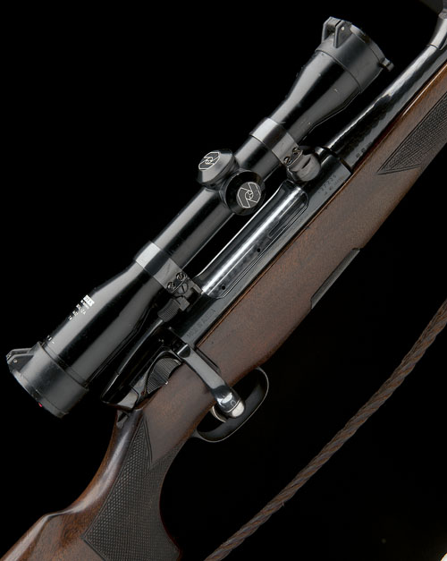 20in. fluted nitro barrel with block-mounted open sights and ramp-mounted blade fore-sight, the receiver mounted with a Zeiss Diatal ZA 4x32T* telescopic sight in quickly-detachable mounts, detachable magazine (with spare), set trigger, blued finish, figured full length pistolgrip stock with hogsback comb, cheekpiece, sling eyes, wooden pistolgrip-cap with Steyr medallion, 14in. pull including 7/8in. ventilated rubber recoil pad