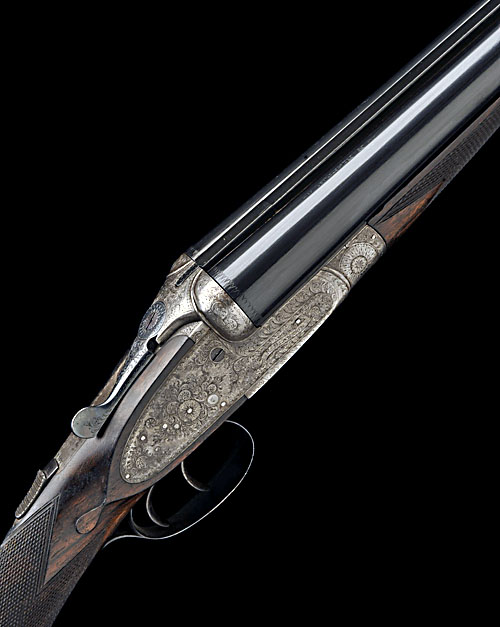 27 1/4in. nitro barrels (shortened) with file-cut matt rib, the tubes engraved 'R. BLANTON. MARKET PLACE. RINGWOOD. HANTS.', 2 3/4in. chambers, bored approx. 3/4 choke in both, treble-grip action, automatic safety with inlaid 'SAFE' detail, border and acanthus scroll engraving, 14 1/2in. stock including 3/4in. rubber recoil pad, weight 6lb. 15oz.