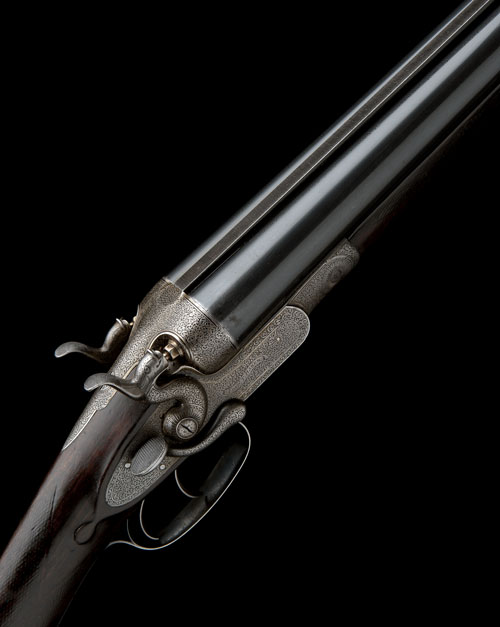 30in. nitro reproved barrels (numbered 4870) with raised matt damascus rib, tubes engraved 'FREDERIC. T. BAKER GUN MANUFACTURER 21. COCKSPUR ST. & 88 FLEET ST. LONDON. MADE OF SIR JOSEPH WHITWORTH'S FLUID PRESSED STEEL NO. 4870', some deep pitting, 2 1/2in. chambers, bored approx. 1/4 choke in both, carved percussion fences, rebounding sidelocks with dolphin hammers, action, lockplates and furniture profusely engraved with fine acanthus scrolls, the underside with F.T. Baker trade mark, the triggerguard dated 1881 in Roman numerals, 14 5/8in. well-figured stock including 1/2in. buttplate, fore-end with grip catch release lever, weight 7lb. 2oz., with a leather leg of mutton case