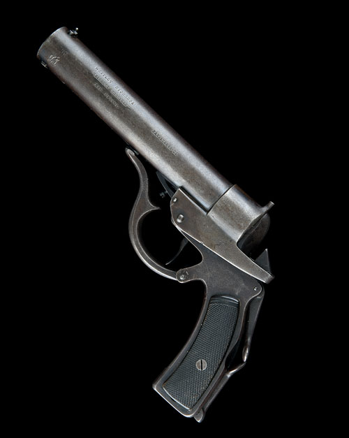Provenance: Much speculation surrounds these very rare air-pistols. It is not known for certain whether they were produced alongside the regular 'Highest Possible' model or were simply the last models to be produced, however it is believed less than 30 examples exist in collections worldwide. Comparing this example with the one from our previous sale (Lot 3, sale A1058) subtle differences will be noted, especially in the mounting of the air-chamber. Serial number 1055 offered here is the highest number recorded for one of these pistols.