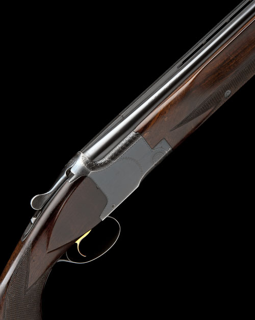 30in. nitro barrels with 7mm ventilated matt top-rib with intermediate bead sight, 2 3/4in. chambers, bored approx. 1/2 and 3/4 choke, hold-open toplever, manual safety with integral barrel selector switch, gold-washed trigger, border engraved action retaining some blued finish, 14 1/4in. pistolgrip stock including 1in. ventilated rubber recoil pad, weight 7lb. 11oz.