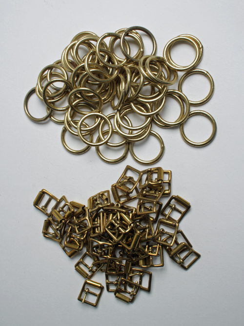 APPROX. 50 SMALL BRASS BUCKLES, 1in. x 1in. with approx. 50 brass rings.