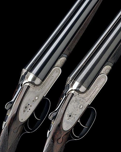 28in. replacement nitro barrels (No.1) rib engraved 'WILLIAM POWELL & SON. 35 / 37 CARRS LANE. BIRMINGHAM', 27in. nitro reproved barrels (No.2), rib engraved 'WILLIAM POWELL & SON. 35. CARR'S LANE. BIRMINGHAM.', 2 1/2in. chambers, bored approx. 1/2 choke in both (No.1) and 1/4 and full choke (No.2), treble-grip actions, toplevers gold-inlaid '1' and '2', border engraving, bright and blued finish overall, 14 7/8in. well-figured stocks including 5/8in. ebonite extensions, repaired crack at head (No.1) and crack to left overhorn and repair to right overhorn (No.2), weight 6lb. 12oz. (No.1) and 6lb. 8oz. (No.2)