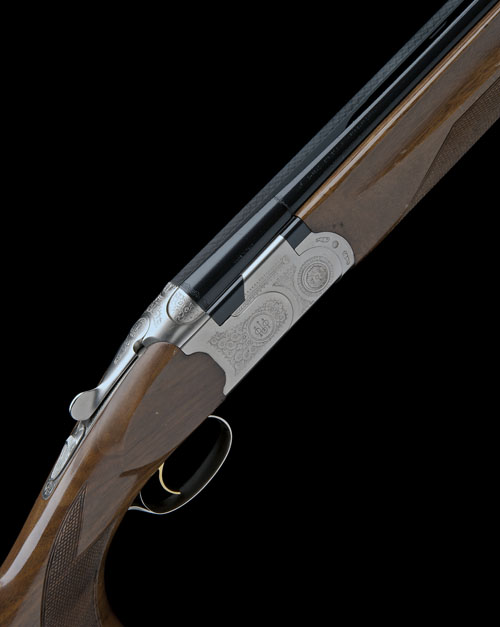 29 1/2in. nitro barrels with 10mm ventilated matt top-rib, 2 3/4in. chambers, bored approx. 3/4 and full choke, hold-open toplever, manual safety, gold-washed single-trigger, acanthus scroll engraving, silver finish, 14 1/2inn. pistolgrip stock including 5/8in. rubber recoil pad, weight 8lb. 1oz.